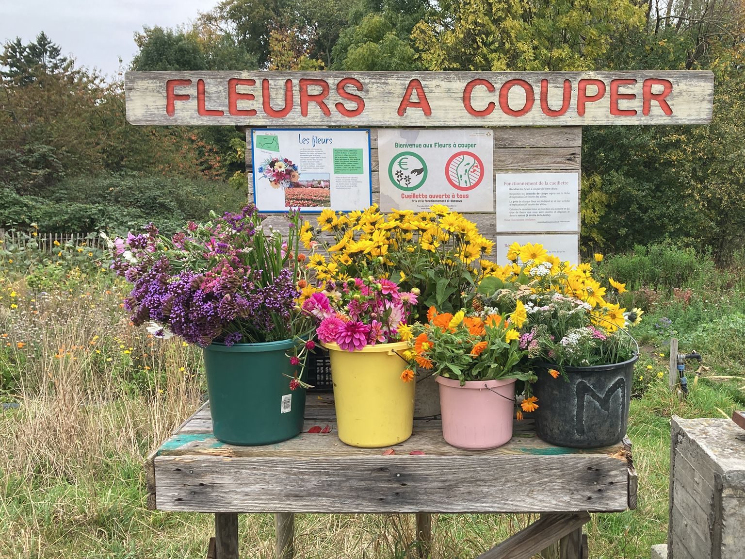 Les fleurs sont produites sur place de façon artisanale et certifiées BIO. Vous les cueillez vous-même et composez votre bouquet, en self-service. Vous les payez à la pièce dans l’urne prévue à cet effet. Le matériel de récolte est disponible sur place.